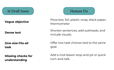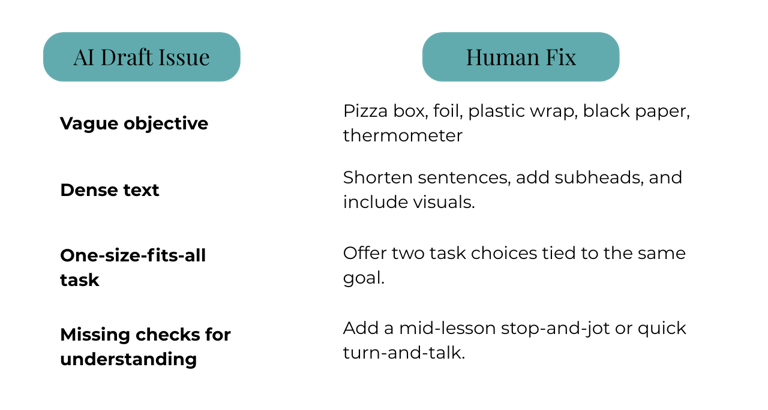 AI Draft Issue Human Fix Vague objective Rewrite with a clear verb and outcome students can show. Dense text Shorten sentences, add subheads, and include visuals. One-size-fits-all task Offer two task choices tied to the same goal. Missing checks for understanding Add a mid-lesson stop-and-jot or quick turn-and-talk.