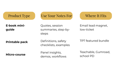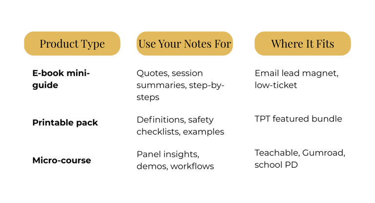 Think of your notes as raw ore. With a little shaping, you can cast them into e-books, worksheets, and courses that sell while you sleep. Your conference gave you fresh angles and current language. That is what buyers want, not textbook dust.